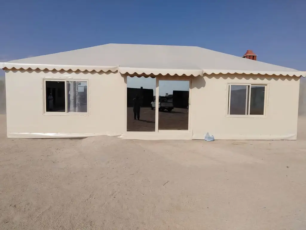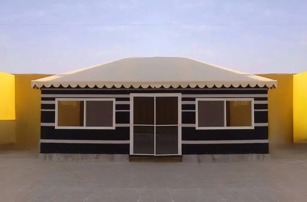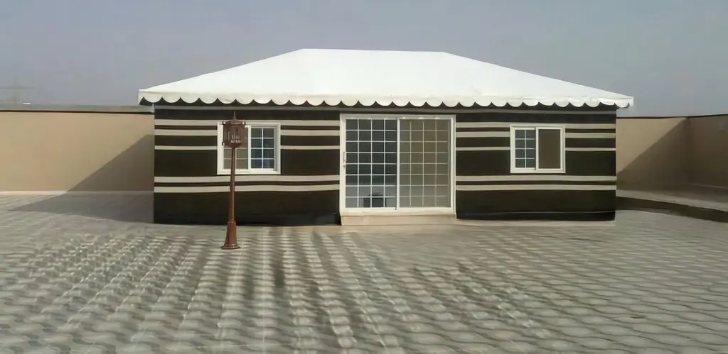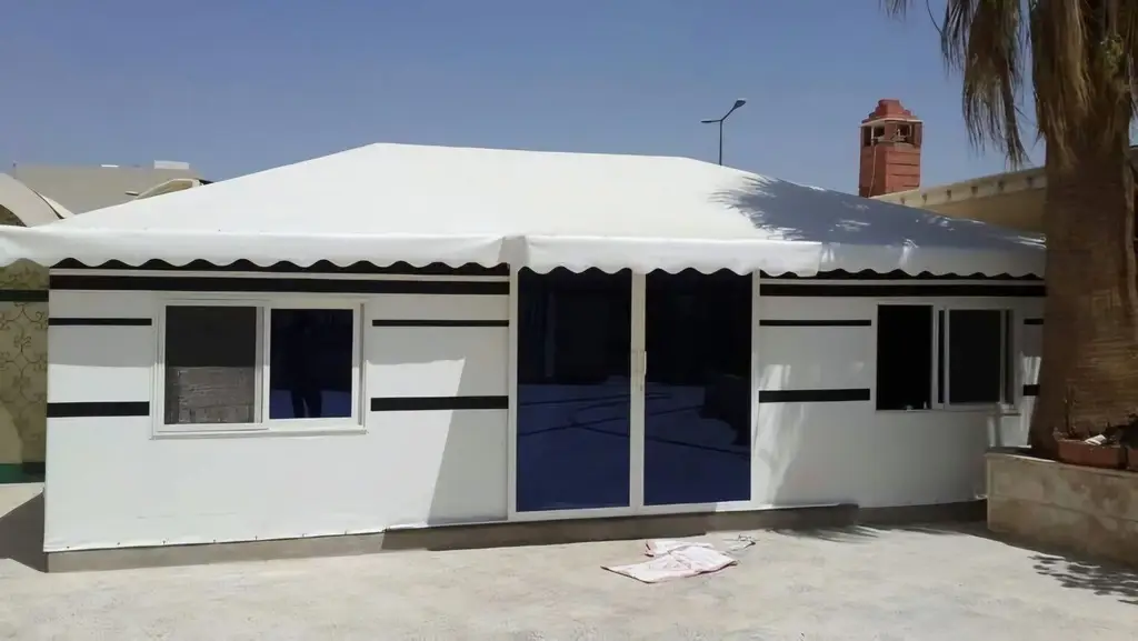 صورة بيت شعر حديث بواجهات زجاجية بتصميم عصري، يوفر مساحات جلوس مشرقة ومريحة مع متانة عالية