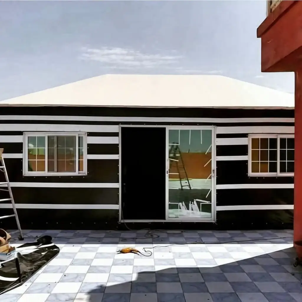 صورة عملية تركيب طبقات القماش والعزل والتشطيب الداخلي لبيت شعر حديث بواجهات زجاجية لضمان العزل والحماية والجمالية