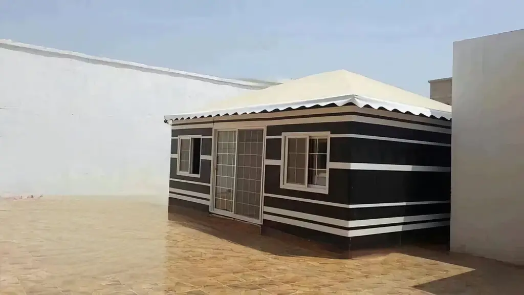 نص بديل للصورة (Alt Text): صورة بيت شعر ثابت ودائم بتصميم متين وصلب، يوفر مساحات جلوس مريحة ومحمية طوال العام