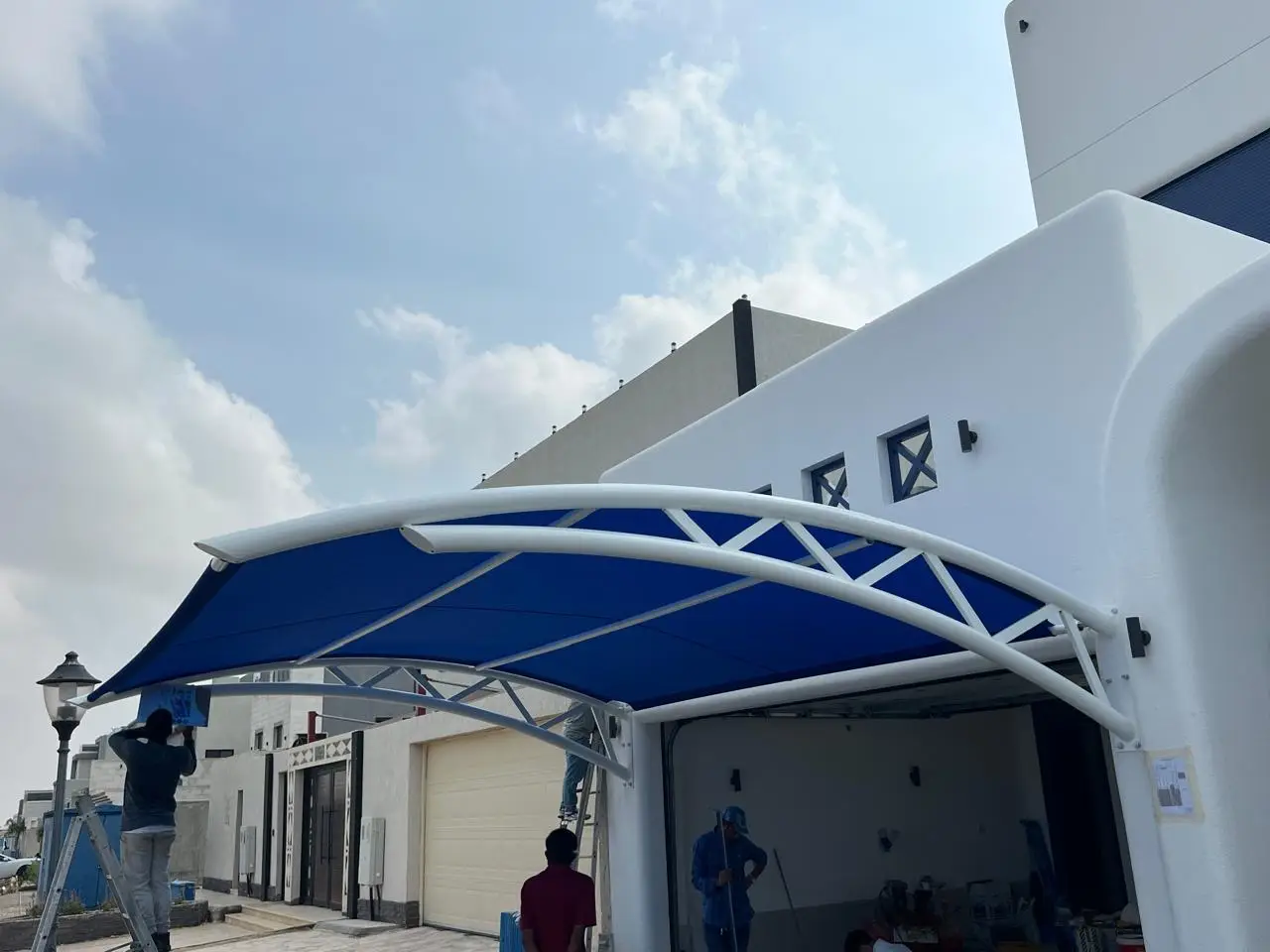 يقوم فريق التركيب المتخصص بتركيب المظلة المقوسة بدقة، ثم يتم فحص جميع الأجزاء والتأكد من ثبات الهيكل وجودة التنفيذ، لضمان حماية المكان وجمالية التصميم.